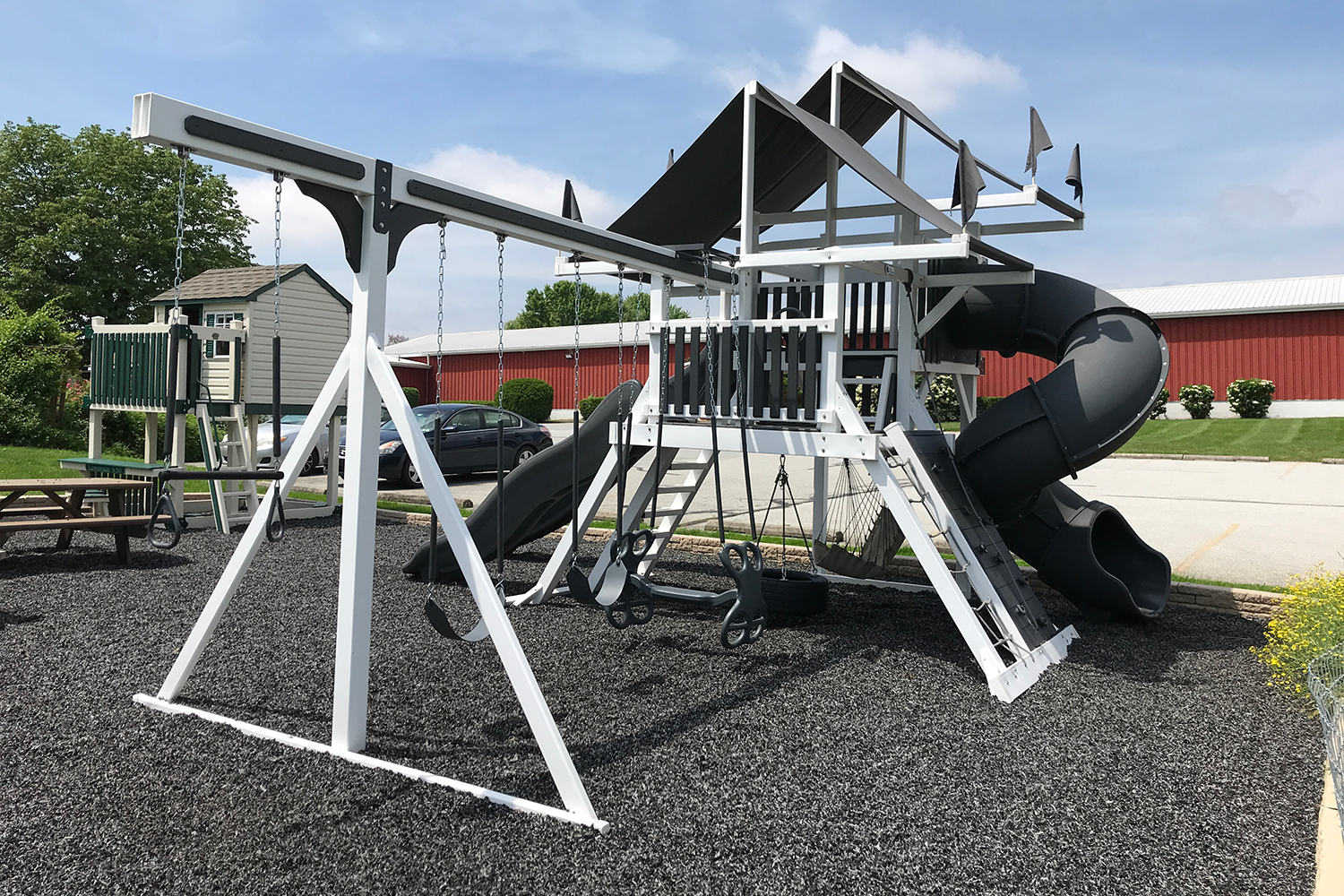double mountain climb with 5' and 7' high decks, 2 - tarp roofs with flags, rock wall with rope, cargo net, access steps with railing, tire swing, 14' turbo twister slide, 14' avalanche slide, 10' avalanche slide, hammock swing, 4-position single beam, dual rider with soft grip chain, 2 belt swings with soft grip chain, trapeze with soft grip chain, steering wheel, telescope.